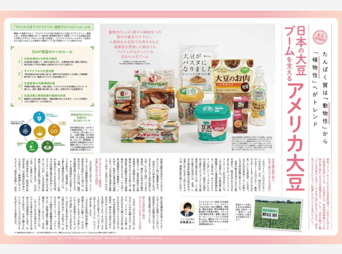 これを機に、USSECでは引き続き 日経グループ等と連携し「US SOY サステナビリティキャンペーン」を実施しています。新聞、雑誌、テレビなどによる広報・宣伝活動、セミナー・シンポジウムの開催、さらには消費者向け料理教室の全国展開するなど喫食機会を提供すべく、さまざまなプロモーション活動を展開しています。